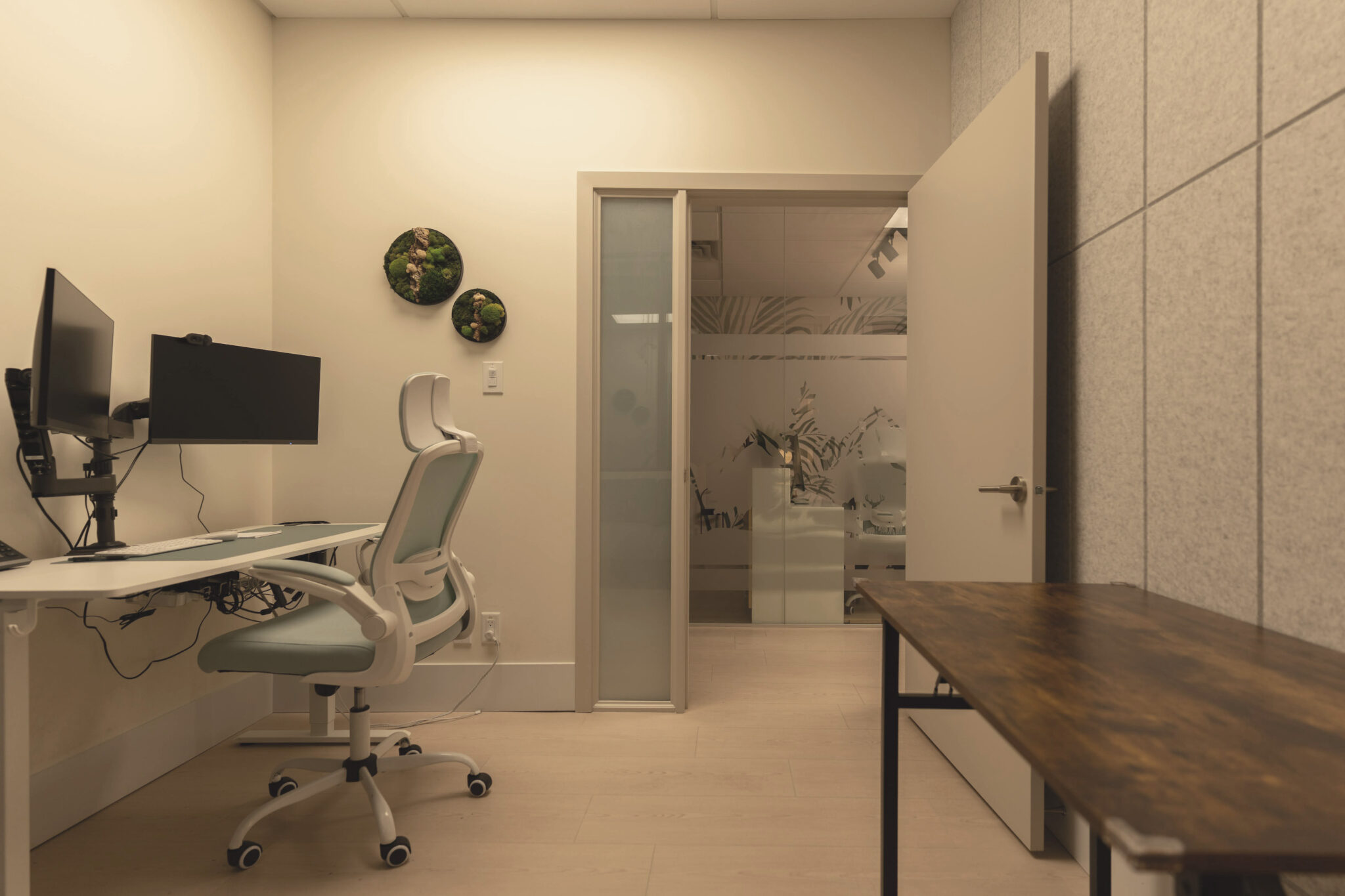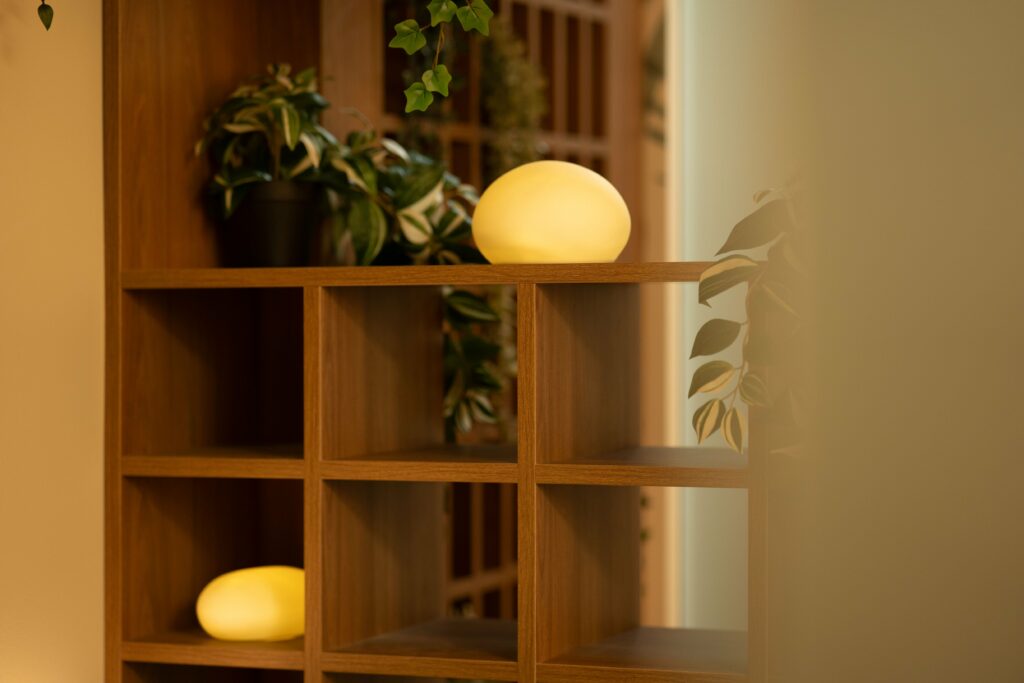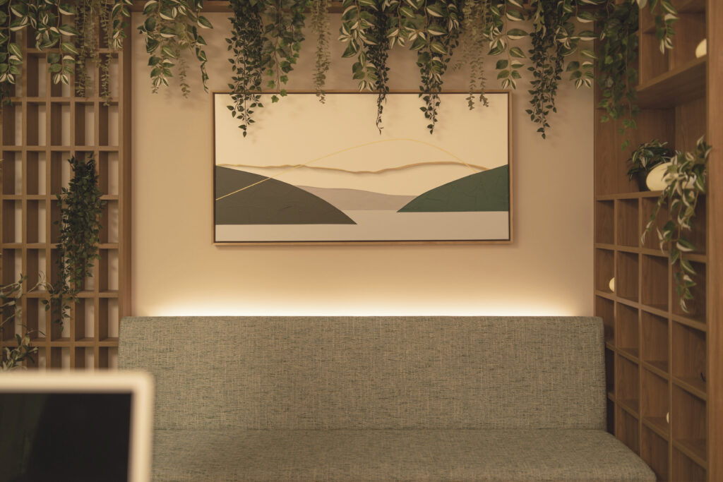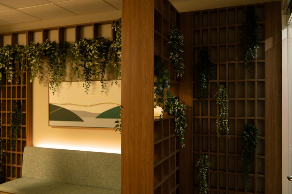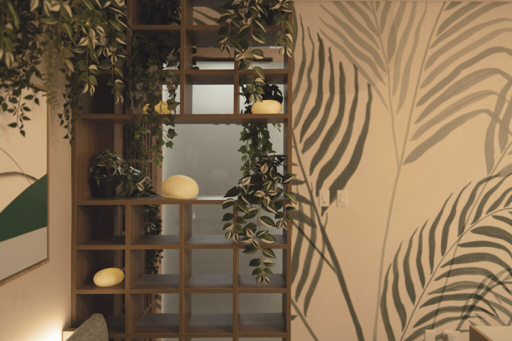 We introduced a custom bench, warm wood detailing, and lush foliage to create an atmosphere that feels like a garden brought indoors. Soft, indirect mood lighting enhances the sense of calm throughout the space. In the treatment rooms, we added texture through acoustic wall panels and dimmable feature lighting to create a soothing, intimate environment. The panels also improve sound control and acoustics, supporting privacy and a more peaceful therapeutic experience.